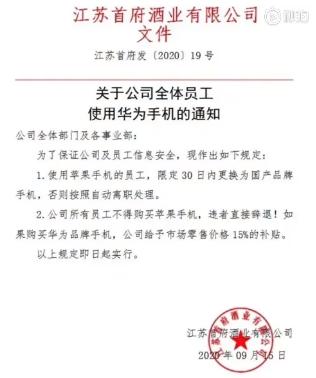 三言财经 9月16日消息,据媒体报道,近日,江苏盐城一公司发文件要求所有员工限期改用国产手机,购买苹果手机者辞退,如购买华为手机则给予市场零售15%的补贴。