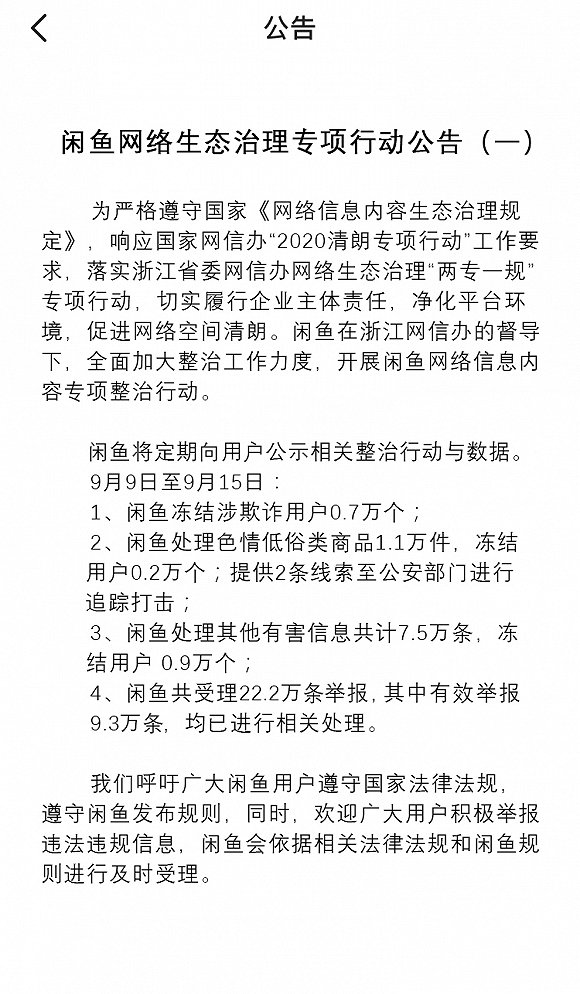 三言财经 9月19日消息,今日,闲鱼App发布公告称,闲鱼将定期向用户公示相关整治行动与数据。其中,9月9日至9月15日,闲鱼冻结涉欺诈用户0.7万个;处理色情低俗类商品1.1万件,冻结用户0.2万人;处理其他有害信息共计7.5万条,冻结用户0.9万个;共受理22.2万条举报,其中有效举报9.3万条,均已进行相关处理。