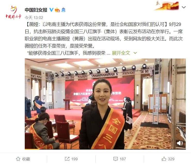 电商主播薇娅被授予 “全国三八红旗手”称号,据悉,在疫情期间,薇娅及其团队向武汉累计捐赠款物价值超过 400 万,为助力湖北复工复产举行多场直播电商活动,累计引导成交金额超过 2.52 亿元,并联合品牌商家向武汉贫困地区的 20 所小学捐赠总价值 200 万元的图书。此外,还举办多场活动助力其他地方复工复产,累计引导成交金额 2500 多万元。