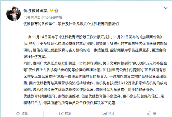 三言财经 11月25日消息,针对资金链断裂,后续9000余万元的补偿一事,优胜教育总裁陈昊通过微博发文称,关于文章内提到的“9000余万元的补偿金额”仅代表社会各机构给出的同等价值的课程补偿。
