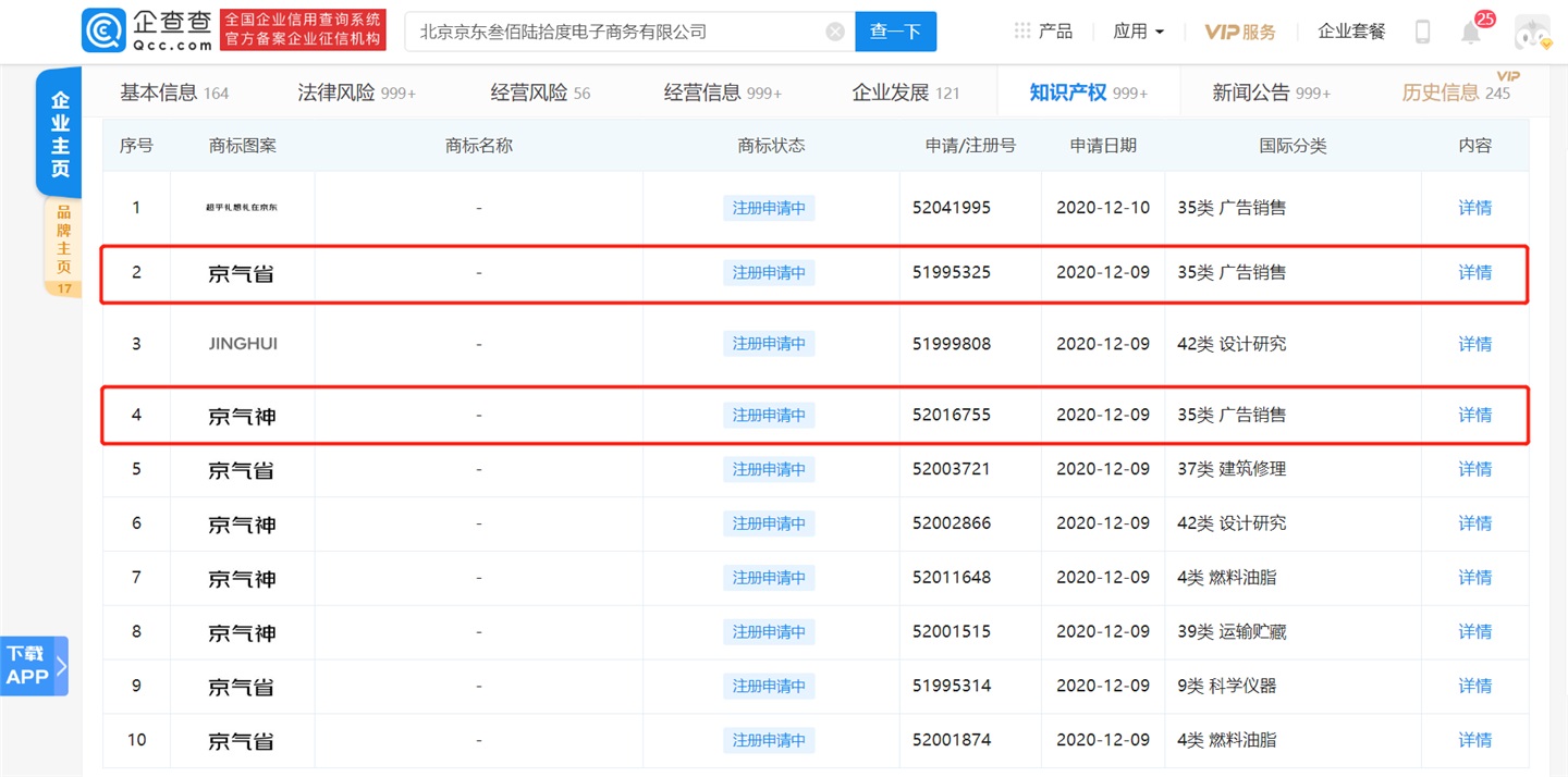 三言财经 12月15日消息,企查查App显示,近日,北京京东叁佰陆拾度电子商务有限公司申请 “京气省”、“京气神”商标,核准注册35类 “广告销售”和42类 “设计研究”等品类上,商标状态为 “注册申请中”。