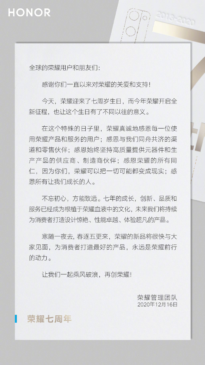 三言财经 12月16日消息,今日荣耀CEO赵明在微博发布公开信,庆祝荣耀7周年的同时,也宣布荣耀新品将会很快与大众见面。