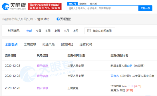 三言财经 12月23日消息,天眼查App显示,近日,有品信息科技有限公司发生工商变更,小米集团高级副总裁王川退出法定代表人,高自光退出总经理,新增白昉为法定代表人、总经理。