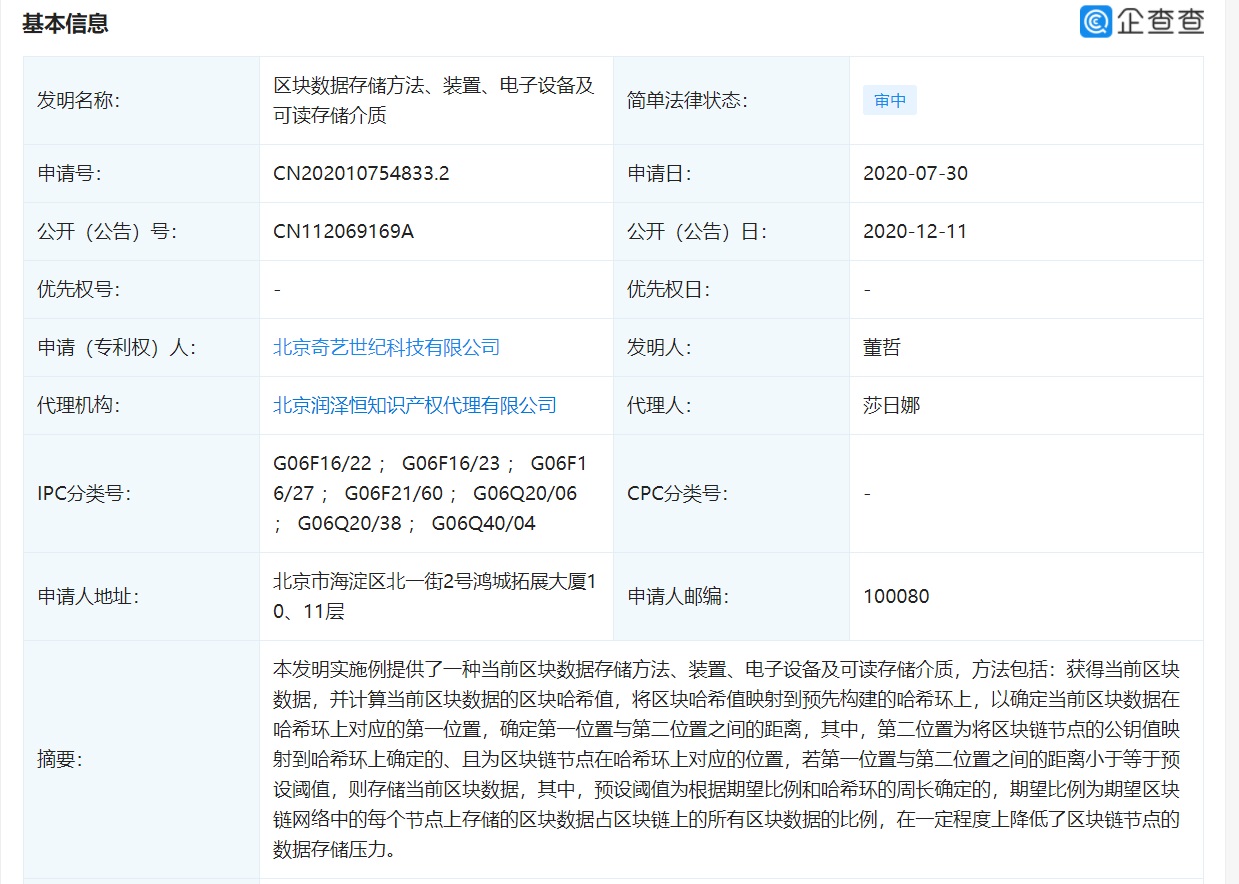三言财经 12月25日消息,企查查App显示,近日,北京奇艺世纪科技有限公司公开了区块链的相关专利,专利名为 “区块数据存储方法、装置、电子设备及可读存储介质”,专利公开号为 “CN112069169A”,专利摘要显示:本发明实施例提供了一种当前区块数据存储方法、装置、电子设备及可读存储介质,在一定程度上降低了区块链节点的数据存储压力。