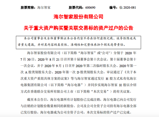 三言财经 12月25日消息,海尔智家发布公告称,截至本公告日,海尔电器所有计划股份已完成注销,海尔电器已向公司发行与注销的计划股份数量相同的新股份。公司及公司全资子公司持有海尔电器全部已发行股份,海尔电器成为公司全资子公司,本次交易标的资产过户已完成。