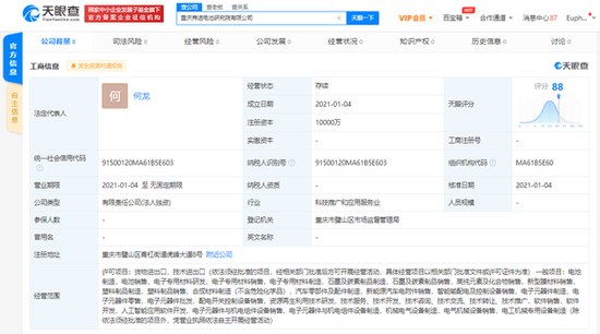 三言财经 1月5日消息,天眼查App显示,1月4日,重庆弗迪电池研究院有限公司成立,该公司注册资本1亿元人民币,法定代表人为何龙。经营范围包括:电池制造,电池销售,石墨及碳素制品制造,石墨及碳素制品销售,新能源汽车电附件销售,智能输配电及控制设备销售等。