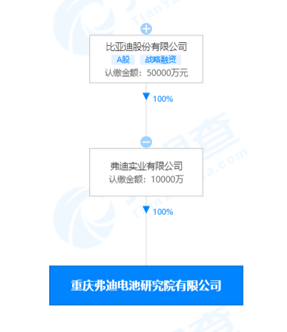 天眼查股东信息图显示,重庆弗迪电池研究院有限公司由弗迪实业有限公司全资控股,后者为比亚迪股份有限公司的全资子公司。