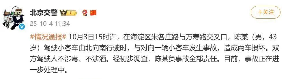 根据北京市交管部门的通报,经初步调查,陈震在此次事故中负全部责任,目前事故仍在进一步调查中。