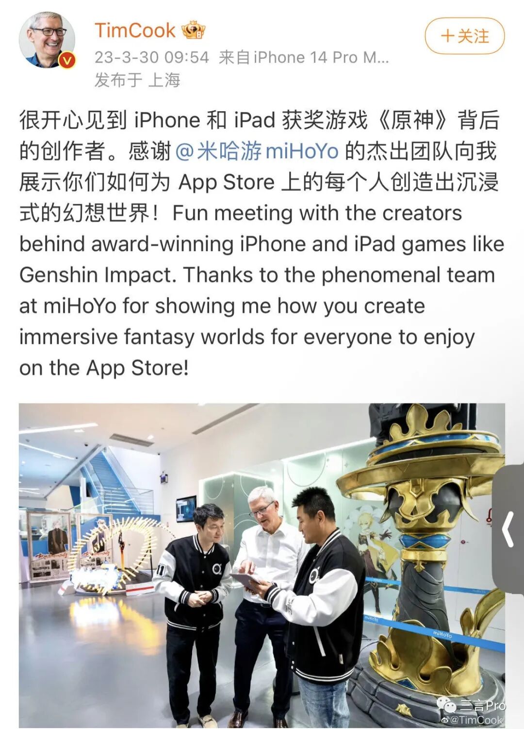 今日苹果CEO库克现身米哈游总部,库克微博发文称“很开心见到iPhone和iPad获奖游戏《原神》背后的创作者。感谢米哈游的杰出团队展示如何为App Store上的每个人创造出沉浸式的幻想世界!”