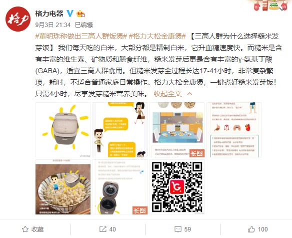 对此,9月3日晚间,格力电器微博以“三高人群为什么选择糙米发芽饭”为题回应称,糙米含有丰富的维生素、矿物质和膳食纤维,发芽后更是含有丰富的γ-氨基丁酸(GABA),适宜三高人群食用。但糙米发芽全过程长达17-41小时,非常复杂繁琐耗时,而格力饭煲可以一键煮好糙米发芽饭,只需4小时。
