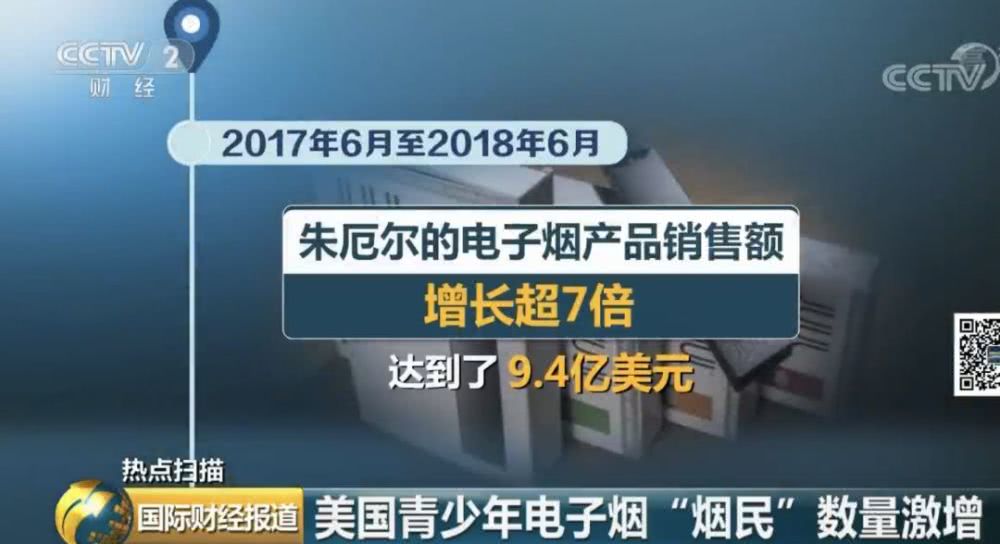 数据显示,美国青少年使用电子烟已达到“流行性级别”。“朱厄尔”的电子烟产品在美国销量呈现爆炸式增长,2017年6月至2018年6月的一年时间里,其销售额增长超7倍,达到了9.4亿美元,去年的销售量占据了美国整个电子烟市场超过70%的份额。